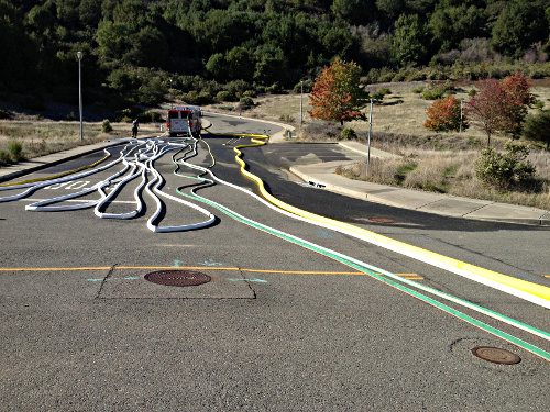 Every year the Moraga-Orinda Fire Department tests their hoses out to make sure it’s in proper working order. I was going for a jog one morning and happened across this scene. The hoses stretch all the way back out of frame for hundreds of feet. Pretty cool! In case you were wondering, the wider yellow hoses are for connecting from the hydrant (especially useful in hilly Orinda), while the white ones are what the firefighters hold closer up. They both fit on the fire engine itself.