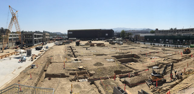 Check out the latest progress on the Broadway Plaza redevelopment in downtown Walnut Creek. In these photos you can see Macy’s wrapped in black at the far end with the new multi-level parking structure at left. Check out all that dirt as the demolition of the existing buildings has been completed. In the photo below you can also see the open section of the Plaza at right.