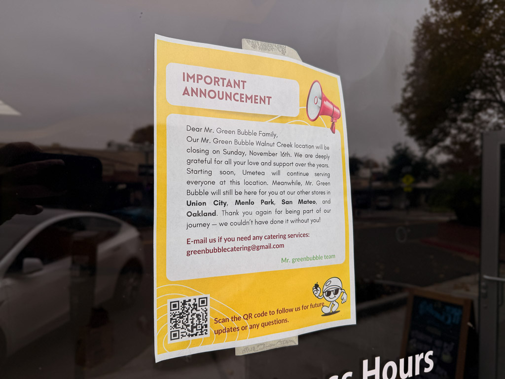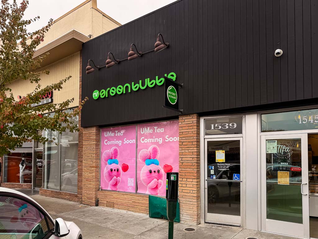 Mr. Green Bubble, which opened 9 years ago in downtown Walnut Creek, has closed. In its place, UMe Tea will be opening soon. And for anyone wondering, my family included, whether “UMe” refers to the Japanese plum flavor (ume), it does not. The name actually stands for “U” and “Me.”