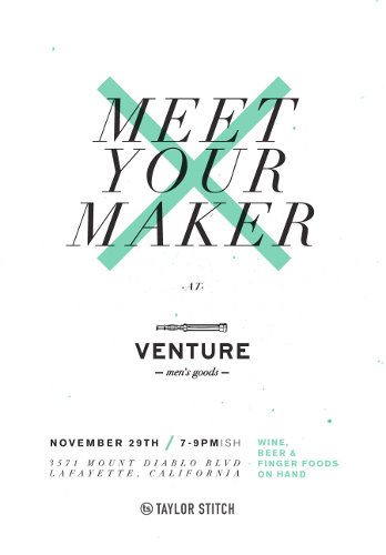 Venture Men’s Goods is hosting an open house on Thursday, November 29th from 7pm – 9pm featuring the founders of Taylor Stitch, “makers of well-crafted shirts and jeans made in San Francisco. We will have libations and bites to kick off the holiday season.” Venture is located at 3571 Mt. Diablo Blvd. a few doors down from Patxi’s Pizza.